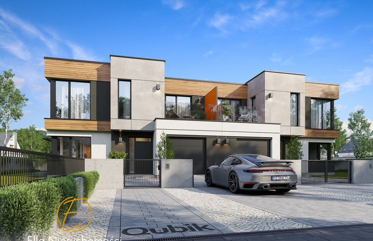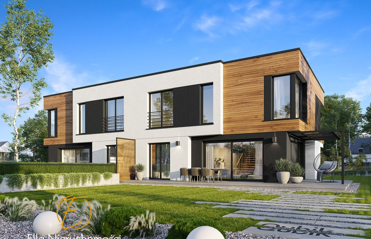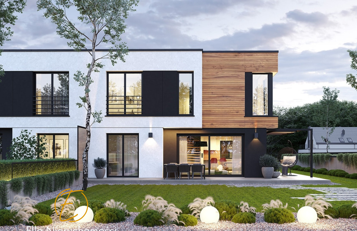 Budynki o nowoczesnej architekturze, z piętrową bryłą, zbudowane na planie zbliżonym do kwadratu. Dom połączony jest wbudowanymi garażami rozdzielającymi wizualnie dwie połówki bliźniaka. Wejścia do obu segmentów domu podkreślone są dominującymi wykuszami wystającymi przed ścianę elewacji frontowej i wykończonymi w kontrastowym kolorze. Zastosowanie dużych przeszkleń, dają domowi dynamiczny nowoczesny wygląd. Od strony ogrodu architektura domu jest spokojniejsza - tutaj główną rolę odgrywają ogród, taras i szerokie przeszklenie łączące salon z trawnikiem.
