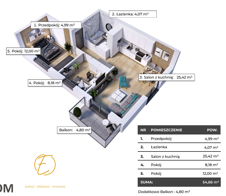 - Salonu z kuchnią o pow. 25,42 m² z wyjściem na balkon