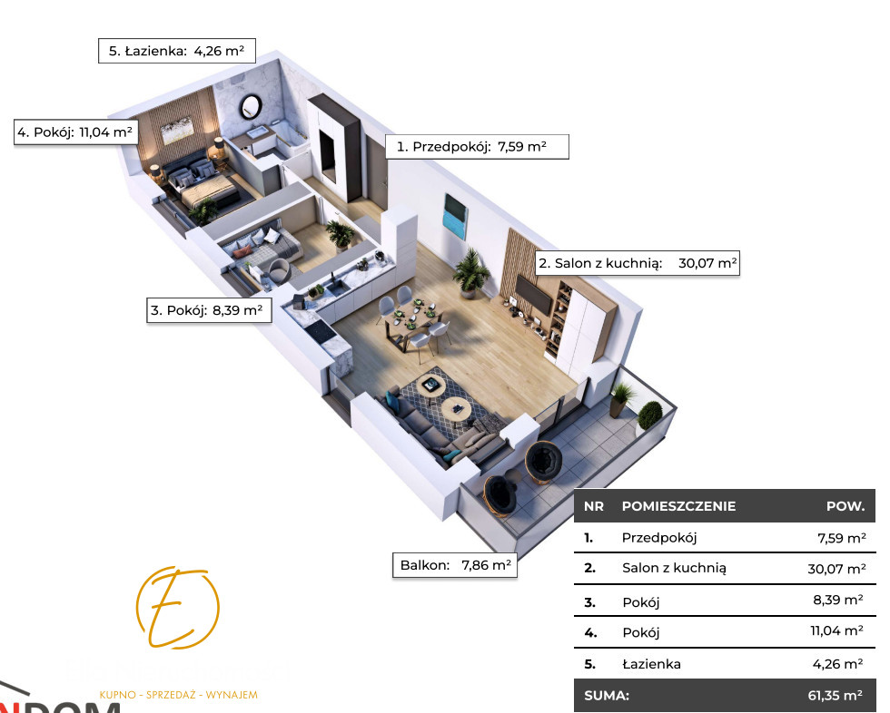 - Salonu z kuchnią o pow. 30,07 m² z wyjściem na balkon